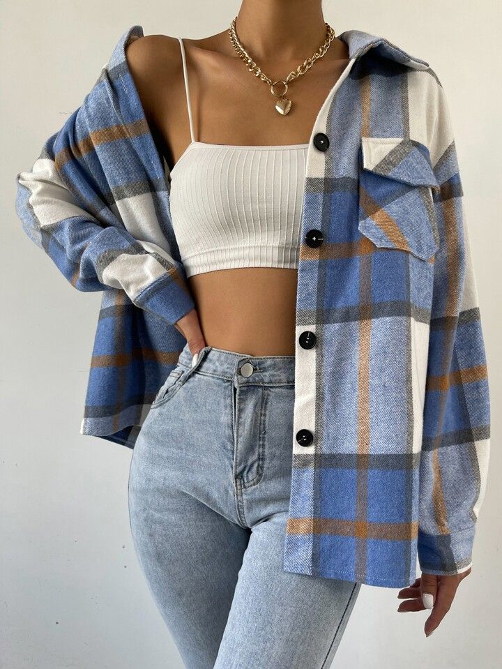 SHEIN Essnce Plaid Flap Pocket Drop Shoulder Coat