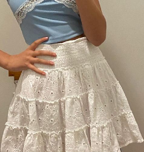 This skirt is actually from the kids dept. It's meant to be a longer skirt for girls, but it's perfect as shorter skirt too! I bought size 5/6 kids and it fits well. Lots stretch!