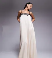 Kaiia exclusive square neck contrast lace detail cami trapeze satin maxi dress in cream-White