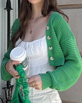 BeingIsabellaChic, everyday summer outfit. Featuring a white corset top, white cargo pants, and a chunky green sweater, and green bag for a pop of color. Perfect minimal chic look that is both trendy and timeless.