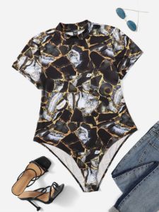 SHEIN Privé Plus Marble Print Mock Neck Tee Bodysuit