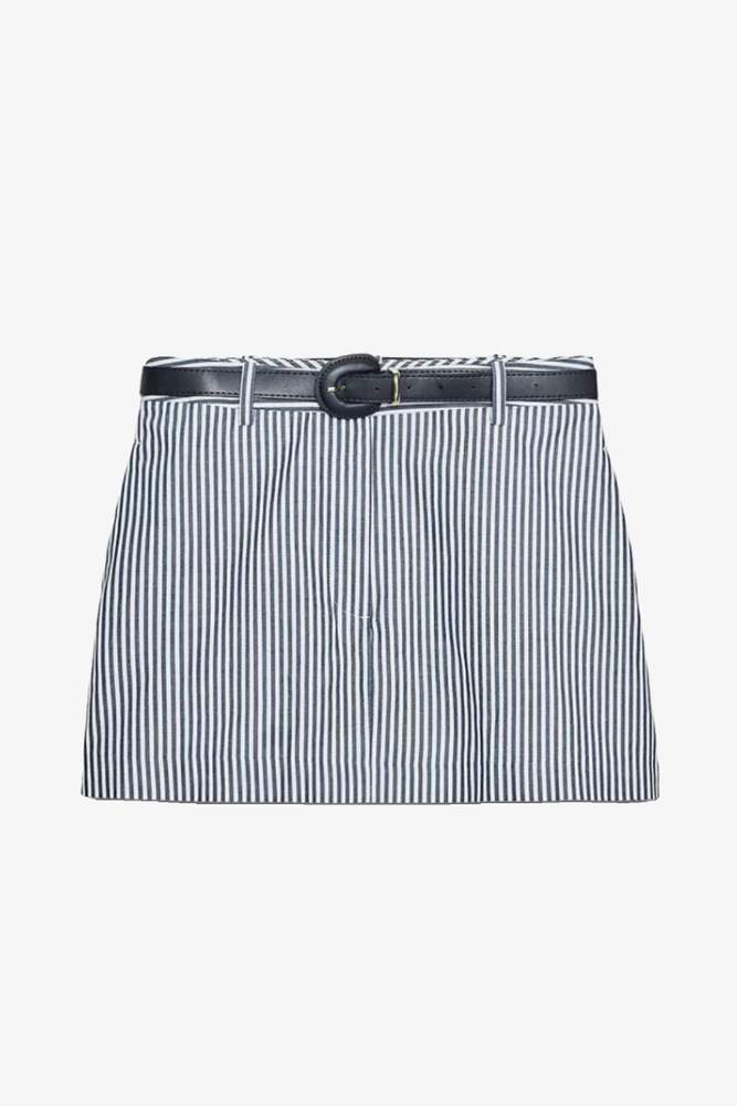 DenverDevoteeWhite crochet sweater with flared sleeves, blue-and-white striped mini skort, browns sandals, small floral handbag, and dark olive sunnies.