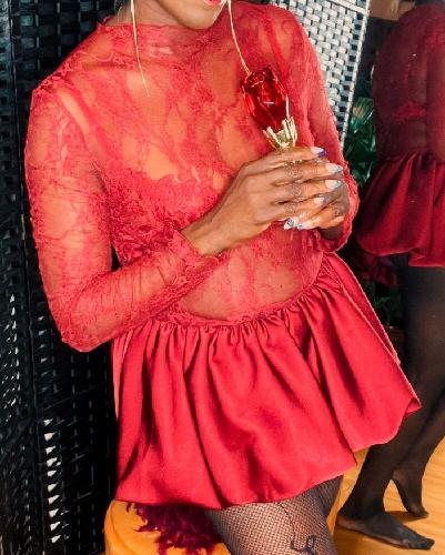 Lace, ruffled hem, sheer, burgundy mini dress. Knitted fabric, 100% polyester, stretch, and fully lined.