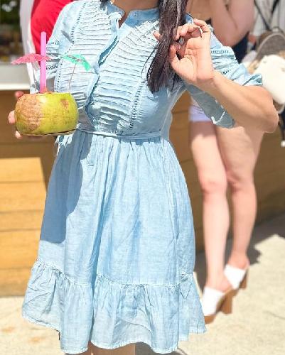 KamalgillA pretty and super soft dress featuring eyelet embroidery, center buttons, adjustable straps and a soft smocked back. Sweetheart neckline, pockets. Imported.