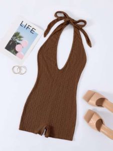 SHEIN Privé Solid Halter Neck Backless Cable Knit Unitard Romper
