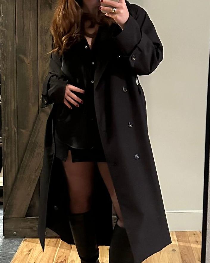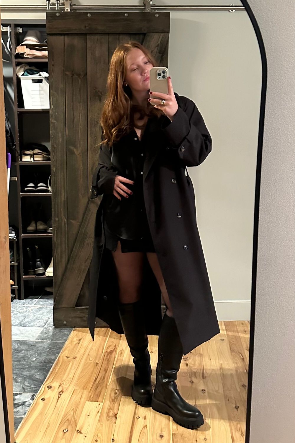 LaneyoneillA monochromatic fit, perfect for a dinner date or drinks with the girls! The oversized trench is perfect for day to night wear
