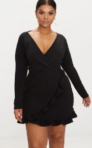 Plus Black Long Sleeve Ruffle Wrap Dress