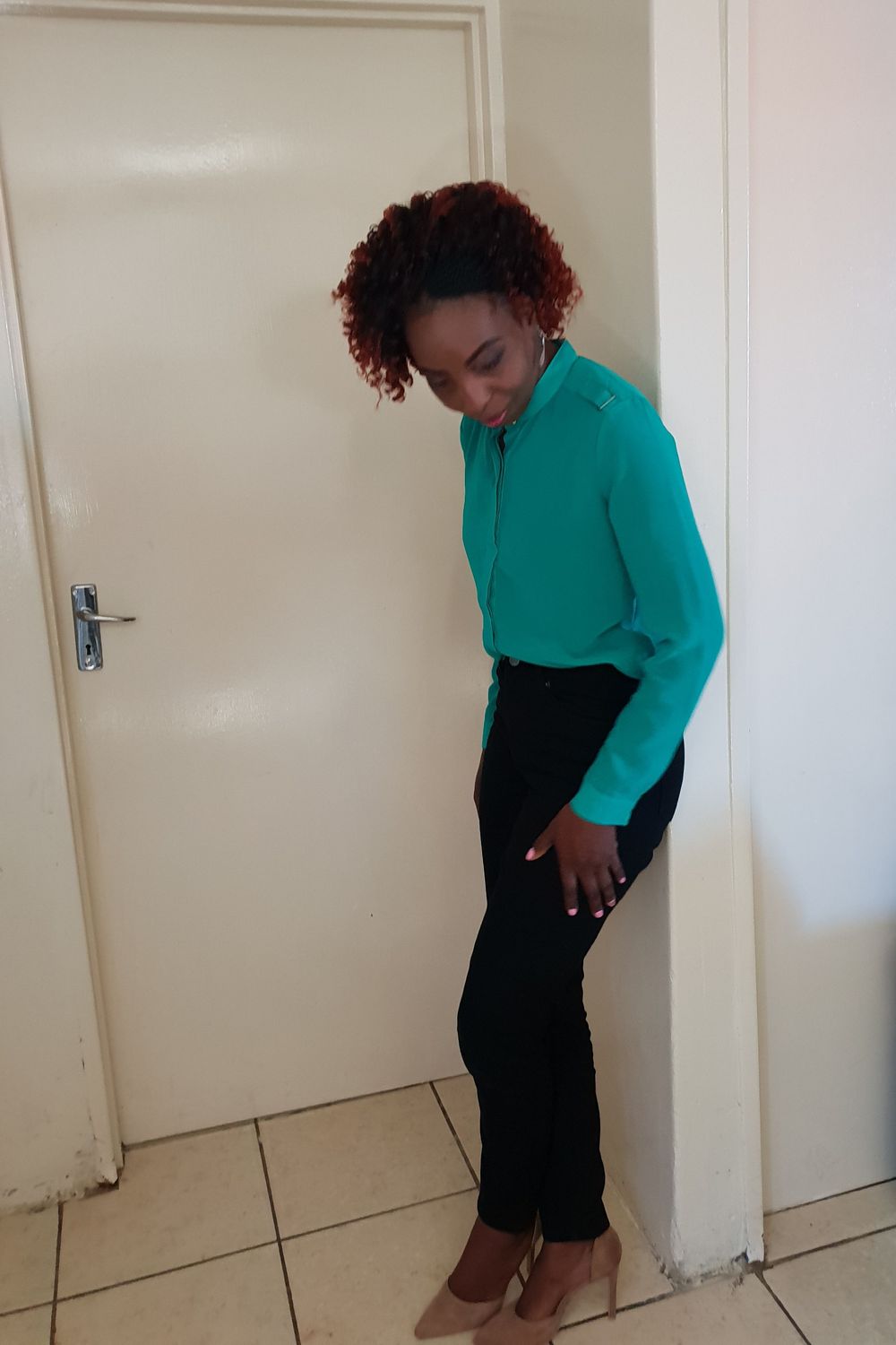 Mim01I'm putting on my jean trousers.I opted for a yellow shirt to make the outfit look brighter and alive.The look is smart casual.I finished the look with green heels.