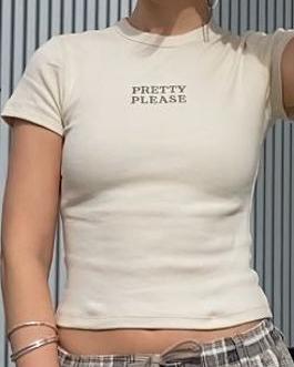 SamstephenStreet style spring look featuring baggy plaid long jorts, a beige baby tee that says pretty please, a white small handbag, a bag charm teddy bear, and white fishnet flats