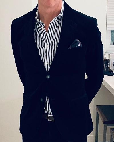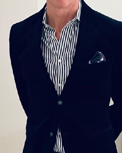 ScottMThis is a navy and white look. The blazer is velvet. The shoes add a little color and kick. My wife bought them for me to get me out of my comfort zone.