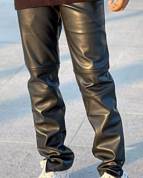 Leather pants trousers, armless singlet, naked wolfe cross bag, Nike shoes, designer jacket, Parada eye glasses,