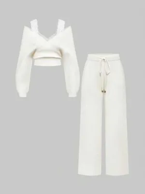 Kawaii 2pcs Women's Off-Shoulder V-Neck Lace Strap Loose Wide Leg Pants Knit Sweater Set, Cozy Home Outfit