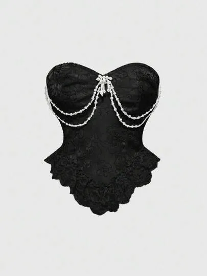 ROMWE Avant Women's Retro Sports Style Lace Trim Drawstring Numeric Embroidered V-Neck Cropped T-Shirt