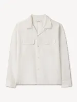 Super lightweight tencel. Very slightly transparent, but the pocket flaps cover my nips so that's good.