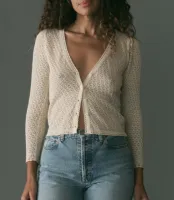 Great Henley style sweater with a slight puff sleeve. Love the big shell buttons