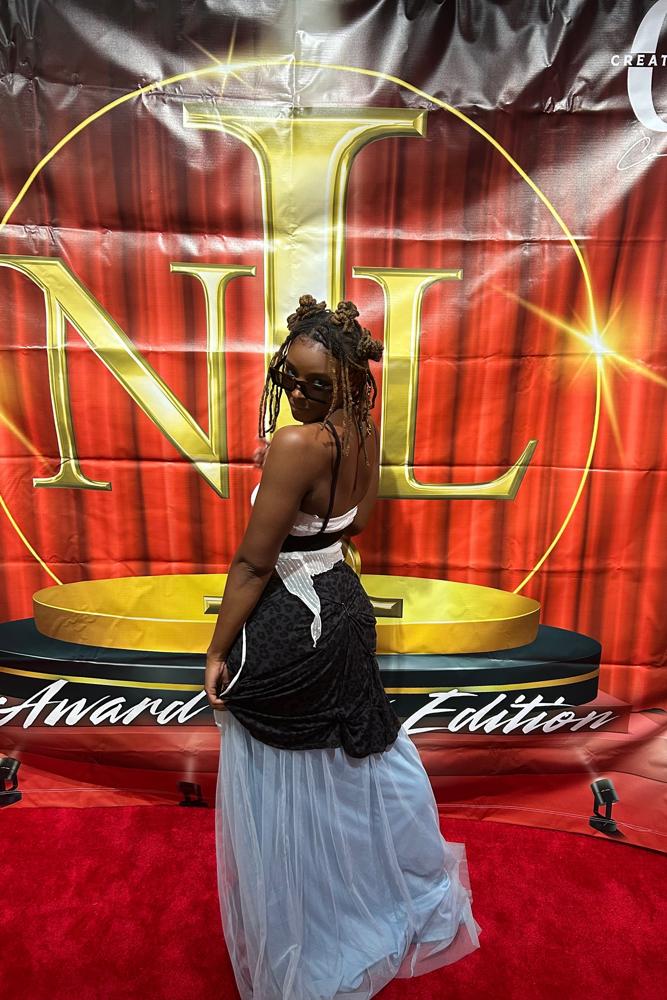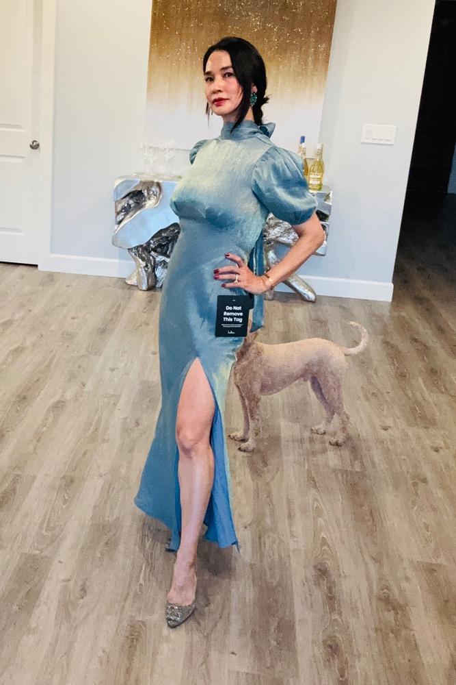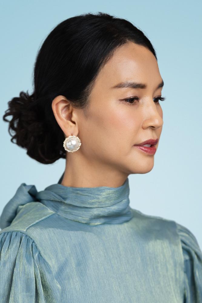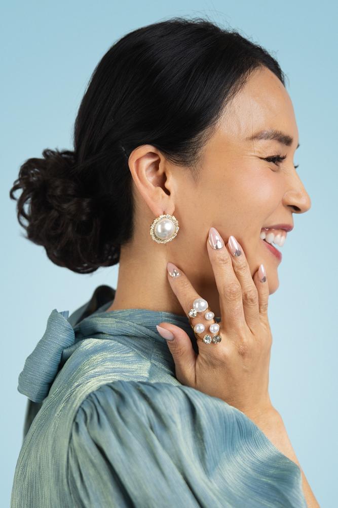 Statement earrings that perfectly tie together the regal and feminine aesthetics of the ensemble.