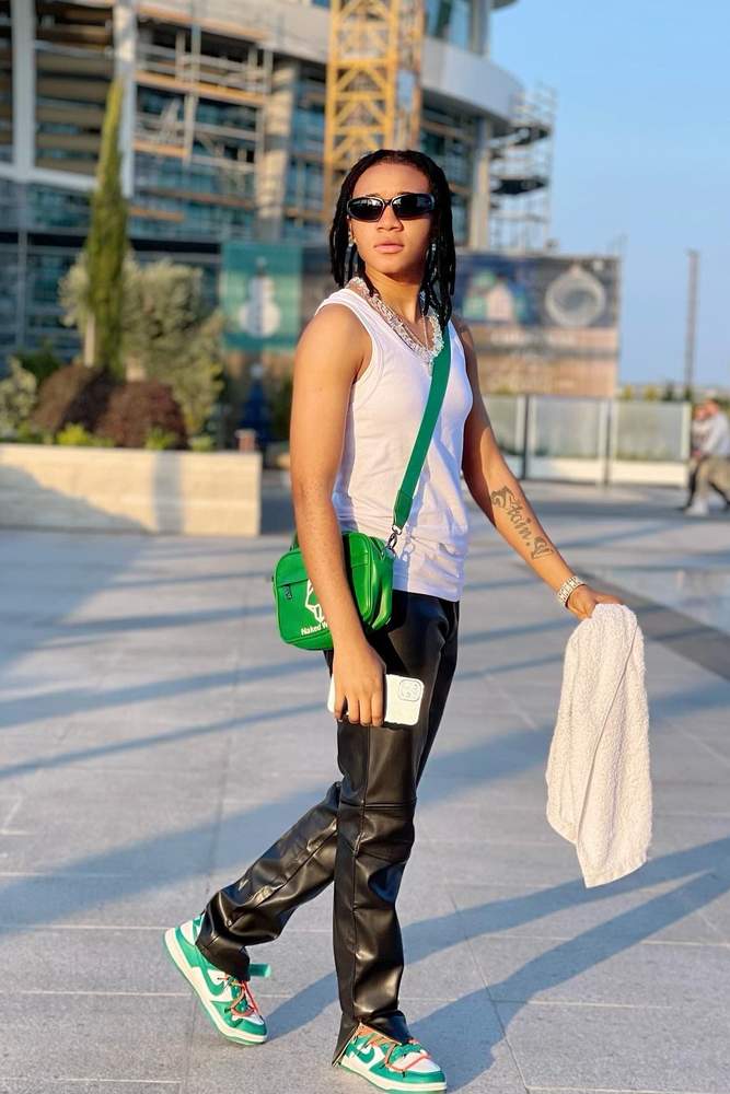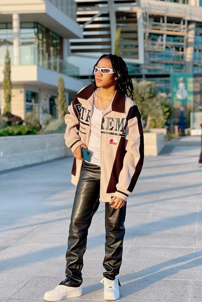 Leather pants trousers, armless singlet, naked wolfe cross bag, Nike shoes, designer jacket, Parada eye glasses,