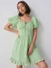 Green Gingham 100% Cotton Puff Sleeve Milkmaid Mini Dress