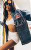Mid Blue Wash Racer Badge Oversized Denim Jacket