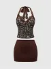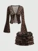 Grunge Punk 2pcs Y2K Vintage Leopard Print Sequins & Lace Trim Halter Crop Top And Ultra Low Waist Mini Skirt Set