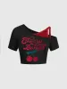 Kawaii Plus Size Lace Patchwork Asymmetric Neck Cherry Print Form-Fitting Top, For Summer
