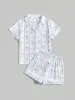 Kawaii Himekaji Bow And Floral Print Short Sleeve Pajamas Set With Lapel And Button Placket, Palace Style For Women, School