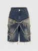 Grunge Punk Star Patchwork, Vintage Wash, Loose Fit, Straight Bermuda Denim Shorts, School