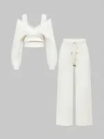 Kawaii 2pcs Women's Off-Shoulder V-Neck Lace Strap Loose Wide Leg Pants Knit Sweater Set, Cozy Home Outfit