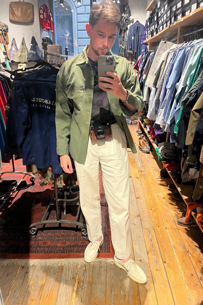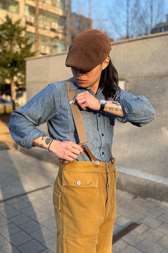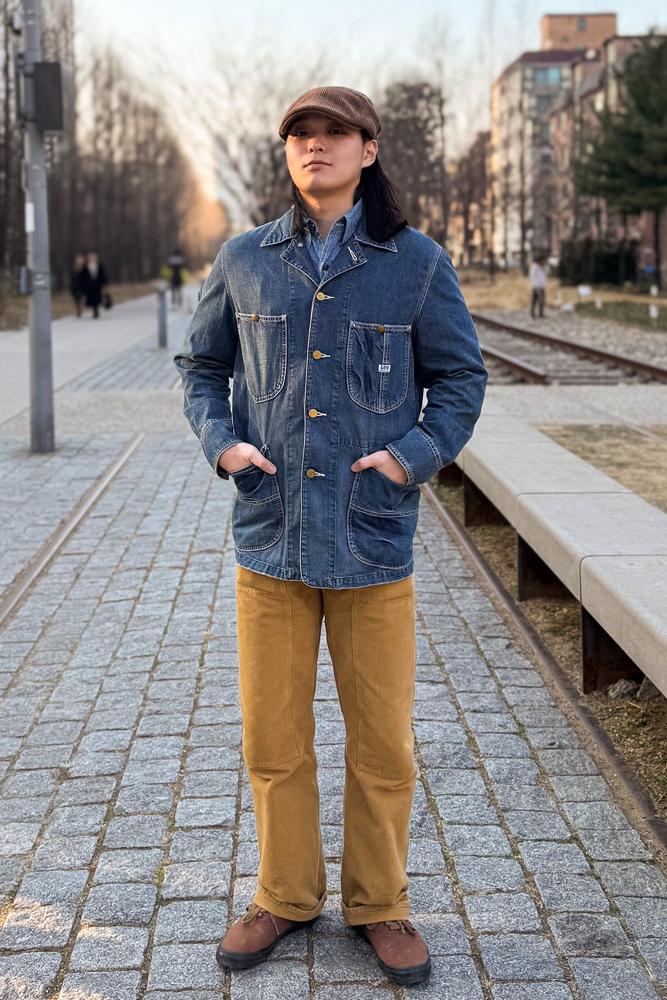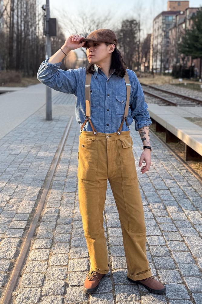 I usually wear W31-32, but got 36 with this one to wear it with the actuall vintage vibes.(I can only wear it with suspenders since it's 5 size bigger than my actual waist) Even tho it's waist is super big, the fit goes perfectly and it's intended by the brand and repro detail way. fabrics are brown duck canvas.
