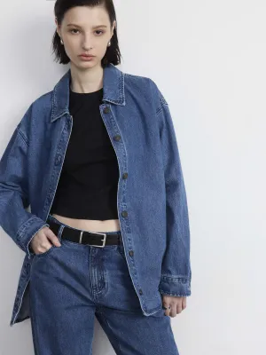 White sleeveless turtleneck top and light-blue wide-leg denim pants