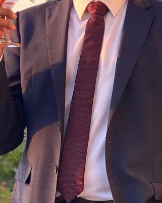 meronchewyClassic navy blue suit, with a pop of burgundy/maroon through a simple tie. Perfect for weddings, formal events, and all things bougie.