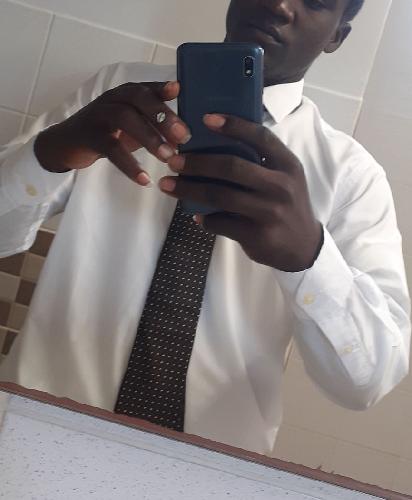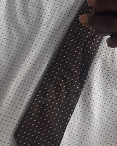 Tenue professionnel chemise blanche homme unicolore à bouton, pantalon long grise et cravate plus chaussures GCCI.