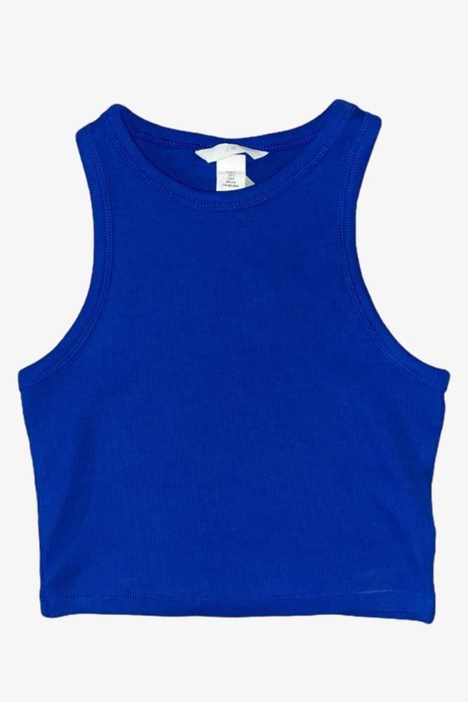 Blue crop top, white shorts, white sneakers, and my go-to bag for hands-free adventuring.