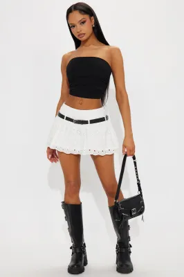 Delicate meets daring. A soft embroidered micro mini skirt and classic country top get a bold upgrade with double belts, one sleek, one cow print paired with matching cow print boots for a statement that steals the show.