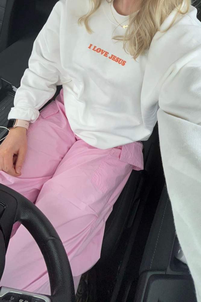 Embrace faith and style with this vibrant 'I LOVE JESUS' puff print crewneck sweater. Made for comfort and everyday wear, it features a relaxed fit that lends itself to effortless layering. This bold statement piece is perfect for casual outings, showcasing both personal beliefs and a trendy aesthetic. Pair it with jeans or joggers for a laid-back look that radiates positivity and warmth.