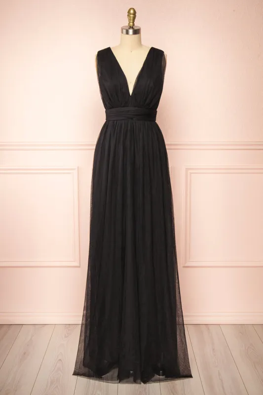 Samina Burgundy | Tulle Maxi Dress with Plunging Neckline