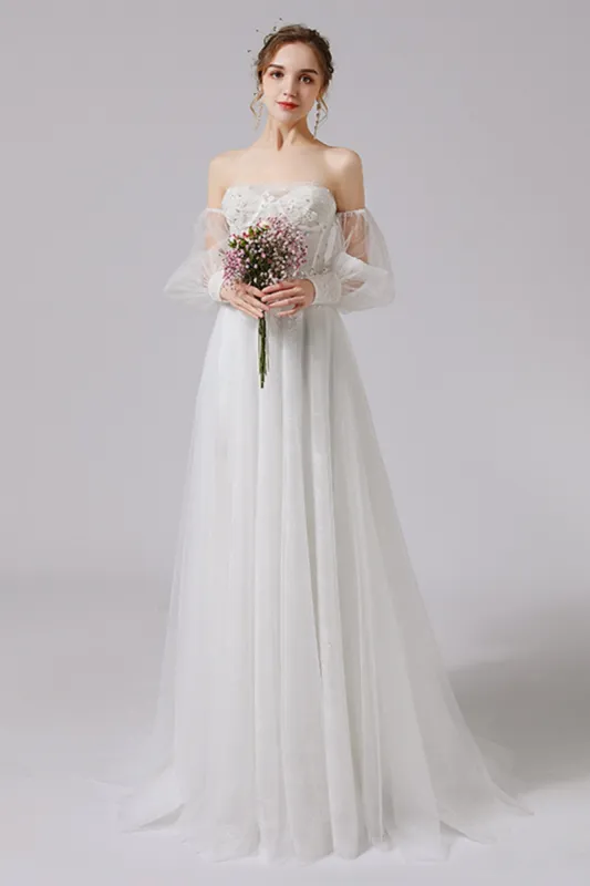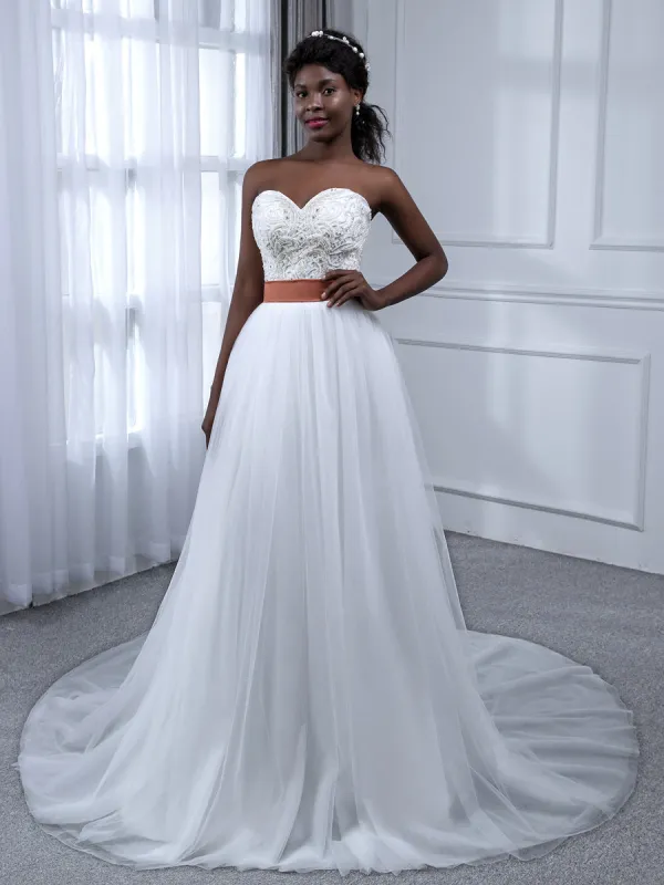 This enchanting A-line tulle wedding dress features a strappy bodice adorned with exquisite beaded and sequined lace appliques. Ideal for a romantic ceremony, it combines elegance with a touch of sparkle, enhancing the graceful silhouette. The flowing design offers ease of movement, making it a perfect choice for the bride who wants to shine both during the ceremony and on the dance floor. From the brand: Beaded and sequined lace appliques cover the strappy bodice of this A-line tulle wedding dress.