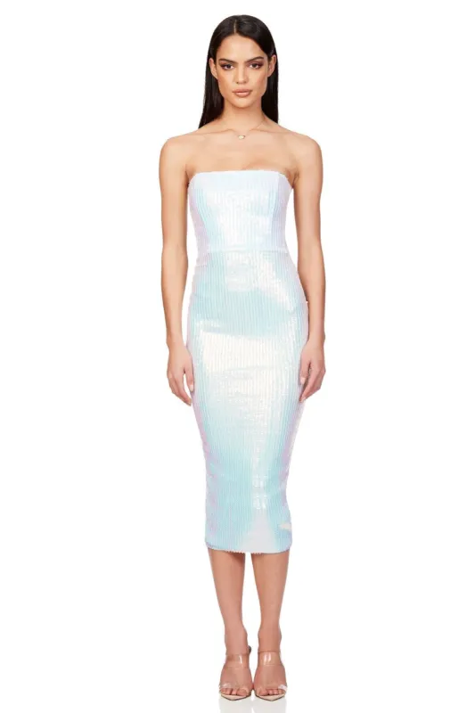 Elevate any occasion with this stunning midi dress featuring a straight, strapless neckline and a body-hugging silhouette crafted from shimmering sequin fabric. The subtle split and invisible back zipper ensure a sleek finish, while the fully lined interior offers comfort with a slight stretch. Ideal for evening events, this dress exudes elegance and individuality, making it a perfect choice for those who appreciate unique, handcrafted designs. From the brand: - Midi length - Straight, strapless neckline - Sequin fabric, fitted to the body - Centre back invisible zipper and split - Fuly lined with a slight stretch - Fabric: 100% Polyester, Lining: 95% Polyester & 5% Spandex Colours may appear slightly different to the website due to lighting, computer picture resolution and monitor settings. **Due to the delicate hand stitching of the sequins, any variations are a part of this garment's individual beauty and are not considered faults. Handle garment with care. Avoid rough surfaces and any friction. Print placement may vary between each individual item. Please refer to care label for garment care instructions. ~section~ Length: 128~130cm/50-51inches (Highest shoulder point to hem taken from size S). It is true to size. If you need more help with sizing, see our size guide or email us at sales@runawaythelabel.com ~section~ Kiana wears a size AU 6 / XS / US 2 and is 170cm tall.