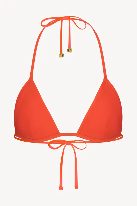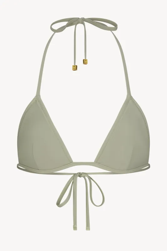 The Isla bikini top features a sleek triangular silhouette with halter neck ties and elegant gold tip ends, secured with a signature gold-tone clasp. Crafted from luxurious matte swim fabric, this top pairs perfectly with the matching Isla String Bikini Bottom and Esme mini sarong, making it an ideal choice for summer getaways. Embrace effortless style and sophistication by choosing this chic piece to elevate beach days or poolside lounging. From the brand: WHY WE LOVE IT Consider our Isla bikini top for your summer getaway. The triangular silhouette cups have halter neck ties that are finished with gold tip ends and is secured with Eterne's logo signature gold-tone clasp at the back. Made from matte swim fabric, just like the matching bottom. Style with Eterne's Isla String Bikini Bottom and Esme mini sarong .