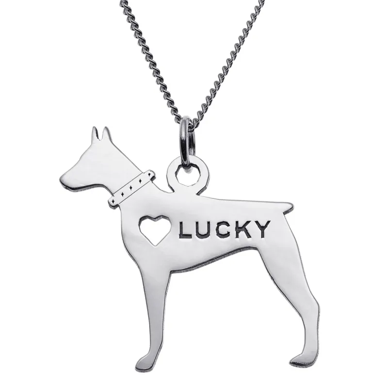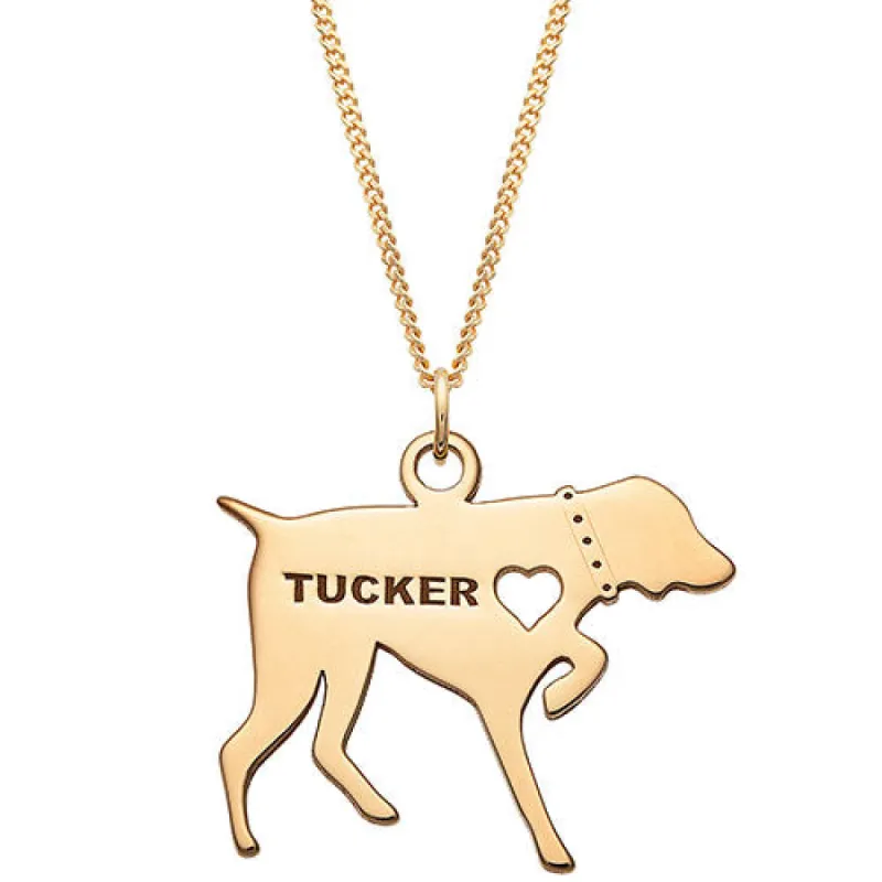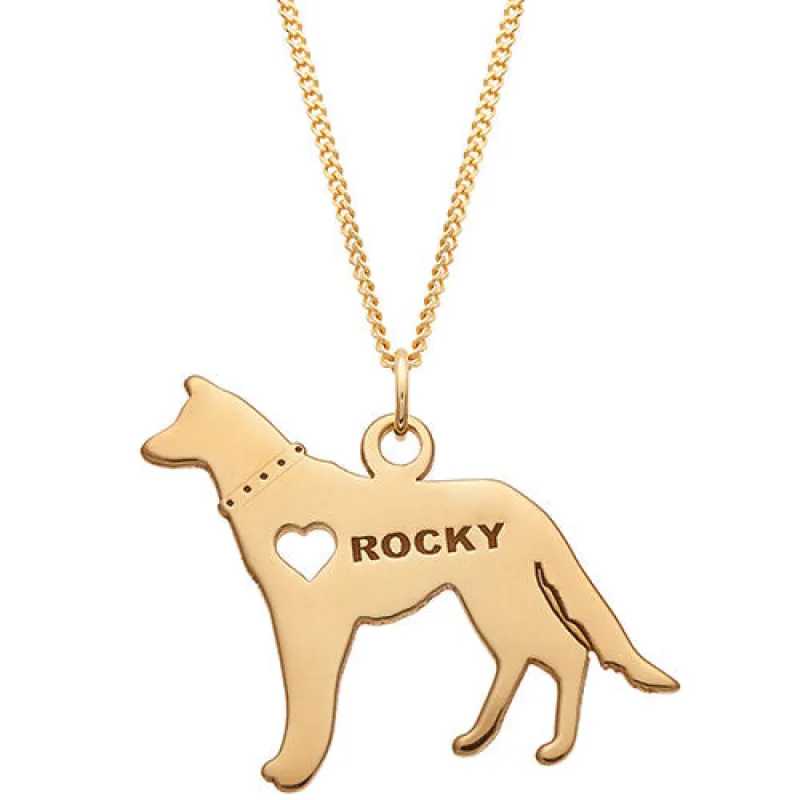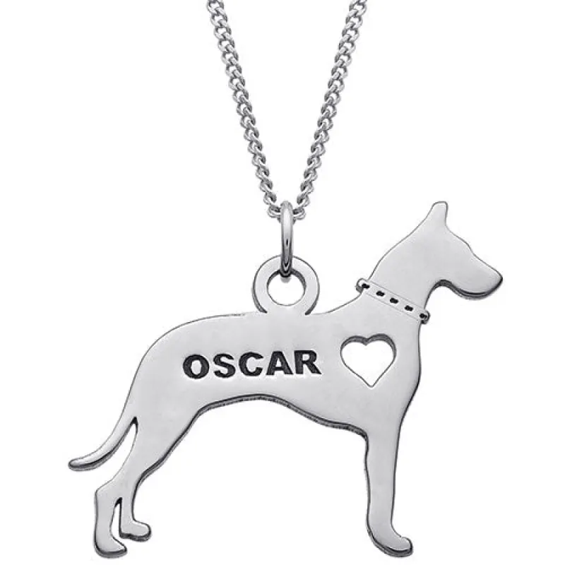 This elegant gold over sterling silver Great Dane silhouette necklace celebrates the bond between dog lovers and their pets. Featuring a charming dog profile with a heart-shaped cutout, it provides personalization options for up to eight letters. Suspended on an 18-inch chain, this piece seamlessly blends style with sentiment, making it a perfect gift for any canine enthusiast. From the brand: This gold over sterling silver great dane silhouette necklace features your favorite dog breed! A giant personality and lovable attitude makes this dog person's best friend ! There is nothing more dependable than the love of a loyal canine. Featuring the profile of a great dane, this item includes space for personalization up to 8 letters. A heart shape cut out adorns this pendant. Add your name or the name of your beloved friend. This pendant is suspended on an 18 inch chain.