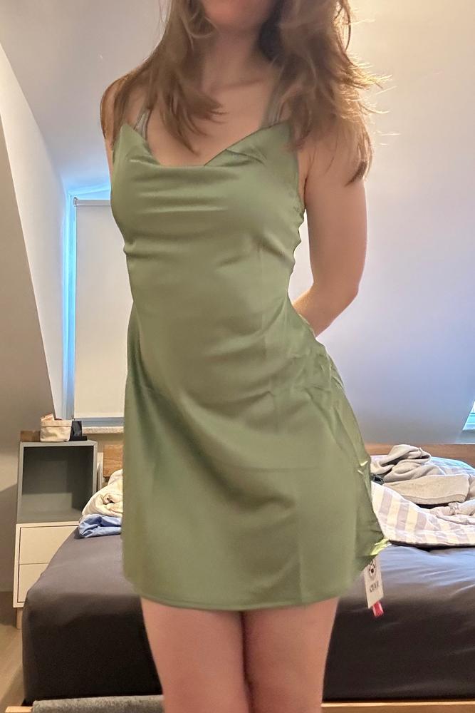 From the brand: Satin Cowl Neck Ruched Butterfly Mini Dress