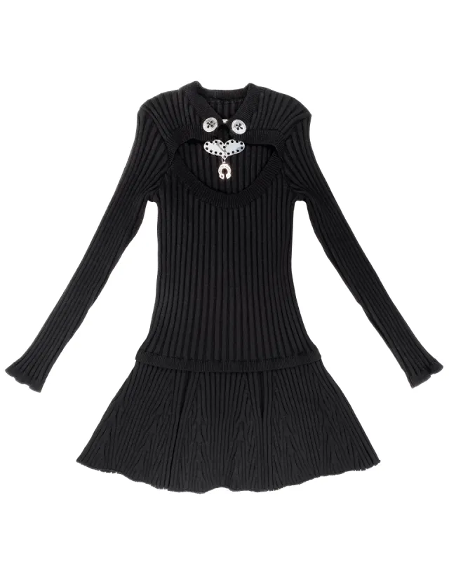 This knitted dress features a striking ribbed texture, combining comfort and style effortlessly. It's crafted from a blend of 70% viscose and 30% polyester, offering a soft feel with slight stretch. The alluring red hue and unique design, including charming button details and a flared skirt, make it a standout piece for any occasion. Perfect for layering or wearing solo, this dress embodies a chic and cozy aesthetic that transitions from day to evening with ease. From the brand: Knitted dress. 70% Viscose, 30% Polyester.