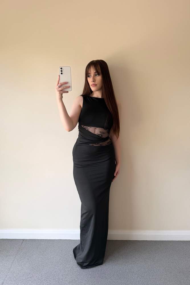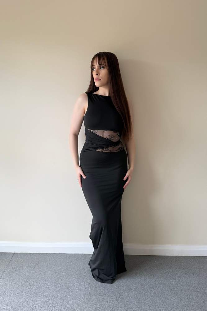 Elevate your evening style with the Karma Maxi Dress. Featuring a rounded neckline and stretch jersey for a sleek fit, this dress is enhanced by a semi-sheer lace waist, blending comfort and allure for unforgettable nights.