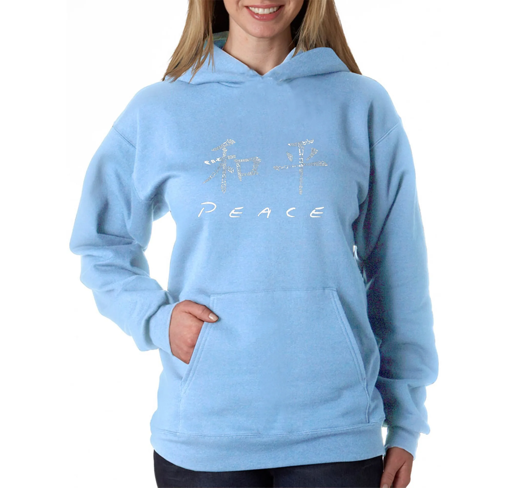This cozy pink hoodie features the word 'Peace' artfully designed in 77 languages, creating a stunning visual statement. Made from a comfortable 50% cotton and 50% polyester blend, it provides warmth and a relaxed fit. With a front pouch pocket and matching drawstring, this hoodie is perfect for casual outings or lounging at home. Proudly printed in the USA, it promotes a meaningful message while ensuring comfort and style. From the brand: Page Title Created using the word Peace in 77 Languages Created using the word Peace in 77 Languages Peace has always been such an important topic in world culture. The power and the message the word and message of peace brings is undeniable. In this design the word for "Peace" was taken from 77 different languages to create the Chinese Symbol for the word Peace. MATERIAL - 50% cotton/50% polyester FEATURES - Front pouch pocket, Matching color drawstring PRINTED WITH PRIDE IN THE USA- All of our products are printed and shipped from Las Vegas, Nevada USA.