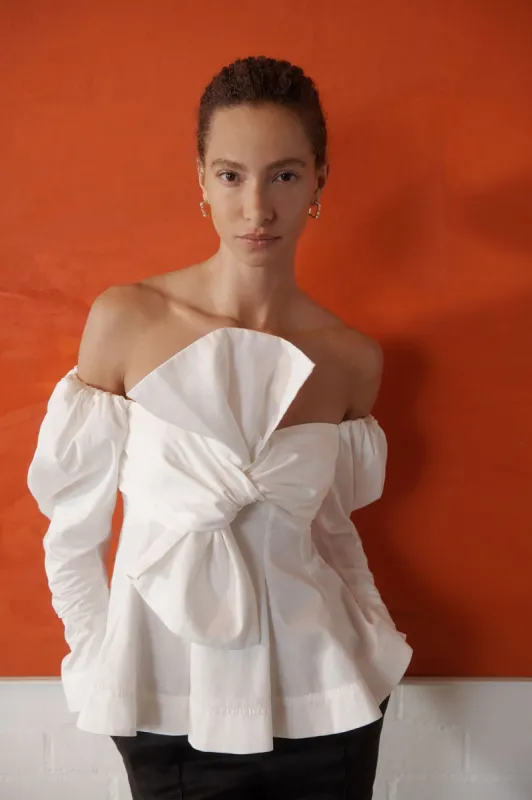 This stunning off-the-shoulder wrap top combines elegance with a modern twist. Crafted from chintz linen that features a subtle sheen, it boasts a fixed wrap design complemented by dramatic puff sleeves and an inner corset for added structure. Ideal for evening outings or upscale gatherings, this top pairs beautifully with high-waisted trousers or skirts, making it a versatile addition to any wardrobe. From the brand: An off-the-shoulder chintz linen wrap top with inner corset and puff sleeves. — Full length — Inner corset — chintz linen with subtle sheen — Puff sleeves — Fixed wrap top