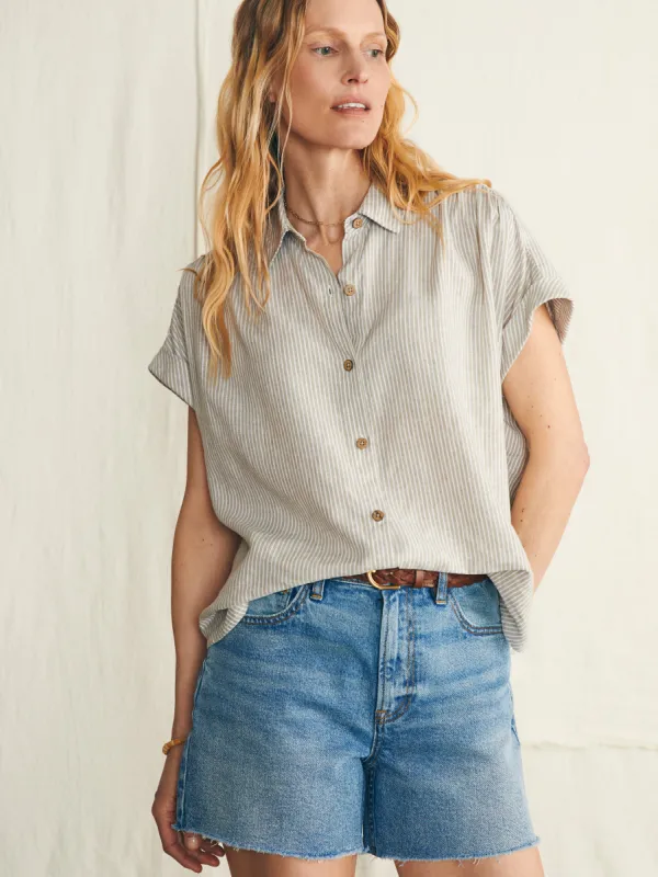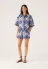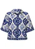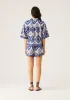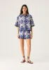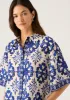 This short sleeve resort shirt showcases a captivating blue tile print, crafted from a lightweight Tencel linen blend. With a relaxed, beautifully tailored silhouette, it features broad sleeves, dropped shoulders, and a sharp collar complemented by matching button front fastening. Perfect for summer outings, its slightly cropped design effortlessly combines comfort and style, making it a versatile addition to any wardrobe. From the brand: Accentuating boxy shaping with our captivating tile print, this short sleeve resort shirt delivers a lightweight touch in a soft linen blend. Flaunting beautiful blues through its print and matching button front fastening, the shirt completes its effortlessly summery appeal with a relaxed silhouette to a slightly cropped length, offset by dropped shoulders and broad sleeves. Our eCommerce model, Sofia, is 177cm tall with a 84cm bust, 59cm waist, 88cm hips, and wears a size 8. Relaxed, boxy shirt with broad short sleeves Blue tile print with matching blue buttons Lightweight resort design within Tencel linen blend Sharp shirt collar above classic button front fastening 80% Tencel, 20% Linen