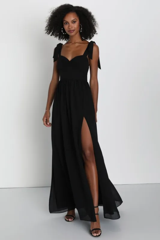 Elevate any occasion with this stunning black maxi dress, designed to effortlessly turn heads. The airy chiffon falls gracefully into a cascading A-line silhouette, highlighted by a flattering sleeveless surplice bodice and fitted banded waist. A daring thigh-high side slit adds an alluring touch, allowing for freedom of movement. Perfect for daytime gatherings or evening celebrations, this dress pairs beautifully with any standard bra and is fully lined for a refined finish. From the brand: Ready, set, compliments! This airy chiffon dress knows all about crowd-pleasing with its cascading maxi silhouette, topped with a sleeveless surplice bodice that comes in at the fitted, banded waist. A thigh-high side slit adds effortless movement to the cascading A-line skirt. Hidden back zipper/clasp. Fit: This garment fits true to size. Length: Floor length. Size medium measures 61" from shoulder to hem. Bust: Great for any cup size. Waist: Fitted - very fitted at natural waist. Hip: Not Fitted - fuller skirt allows room for hips. Undergarments: May be worn with any standard bra. Fabric: Fabric has no stretch. Fully Lined. Shell: 100% Polyester. Lining: 100% Polyester. Dry Clean Only. Imported. Lulus | Thoughts of Hue Black Surplice Maxi Dress | Size XX-Small | 100% Polyester.
