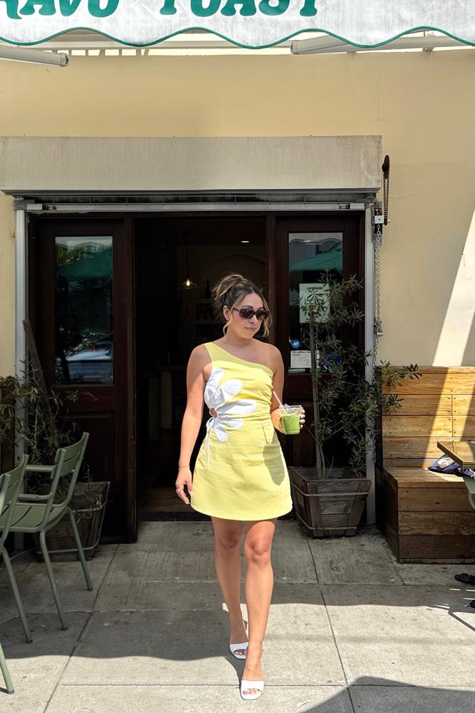 From the brand: You'll be ready to serve stunning summer vibes in the Lulus Sunny Design Yellow Cutout Flower One-Shoulder Mini Dress! Lightweight woven poplin creates an effortless effect as it shapes a one-shoulder neckline with a wide strap and a darted bodice. Flower-shaped, embroidered detail accents the waist, with a cinching, drawstring cutout at the center. Flaring skirt finishes at a mini hem. Hidden zipper/clasp at side. Fit: This garment fits true to size. Length: Mid-thigh. Size medium measures 35" from shoulder to hem. Bust: Great for any cup size. Waist: Fitted - very fitted at natural waist. Hip: Loosely Fitted. Undergarments: May be worn with a strapless bra, adhesive bra, petals, or no bra. Fabric: Fabric has no stretch. Lined. Shell: 65% Cotton, 32% Nylon, 3% Spandex. Lining: 100% Polyester. Hand Wash Cold. Do Not Bleach. Line Dry. Iron Low Heat. Imported. Lulus | Sunny Design Yellow Cutout Flower One-Shoulder Mini Dress | Size X-Small | 100% Polyester.