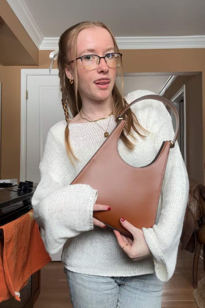 From the brand: This exquisite tan leather structured shoulder bag by Staud is the perfect piece to elevate any look. Crafted with the label's signature smooth leather, this cult-favored classic features a trapezoidal silhouette that is sure to add an elegant and tasteful touch to any wardrobe. Exuding exclusive sophistication and a timeless appeal, the Rey is the ultimate accessory for fashion-forward style.