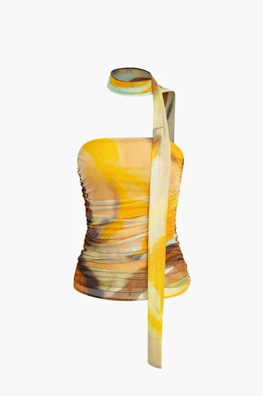 Abstract Print Mesh Ruched Asymmetry Tie Tank Top